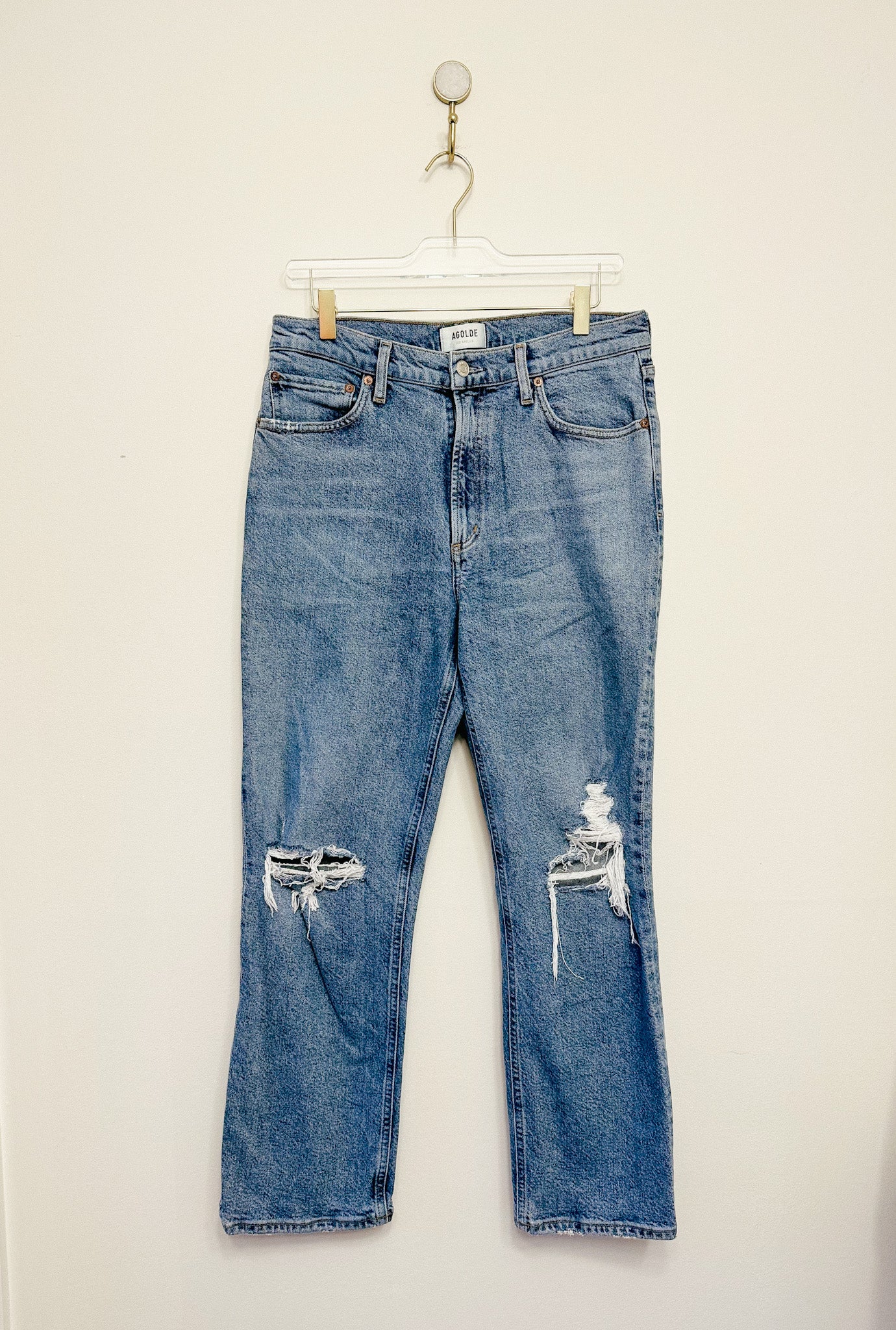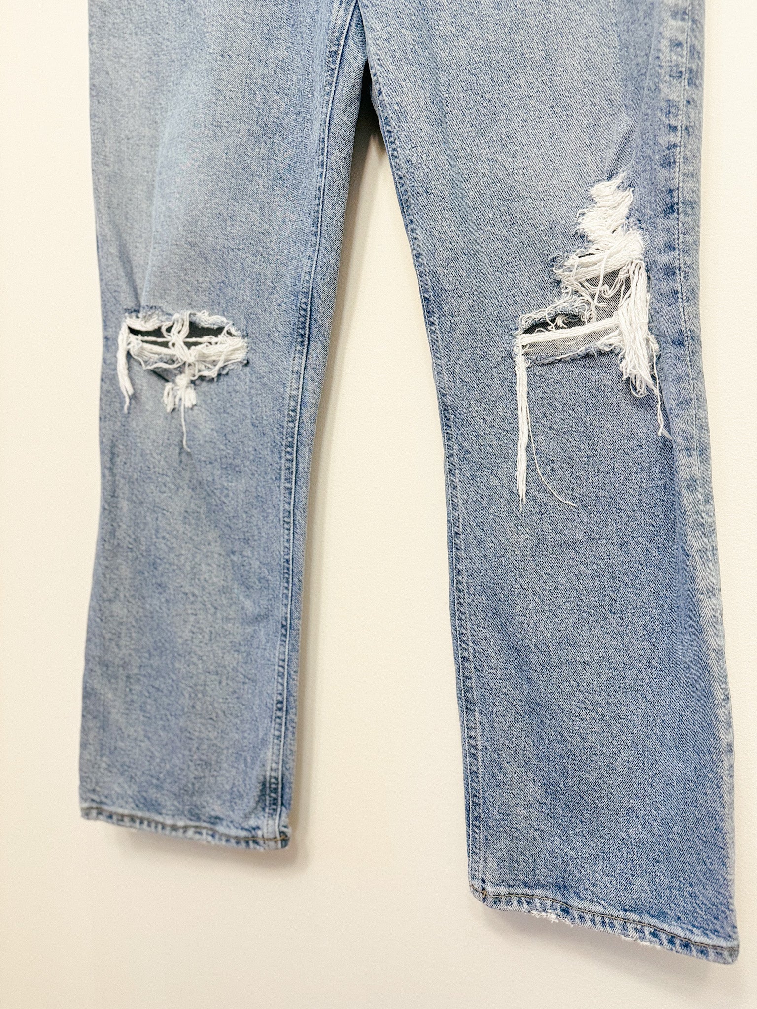 Rock the AGOLDE Wilder Mid Rise Straight jeans with some light fading and destroyed detail. Zip it up and button up for a seamless fit. Plus, it has 5 pockets to store your essentials. Who said fashion couldn't be functional?