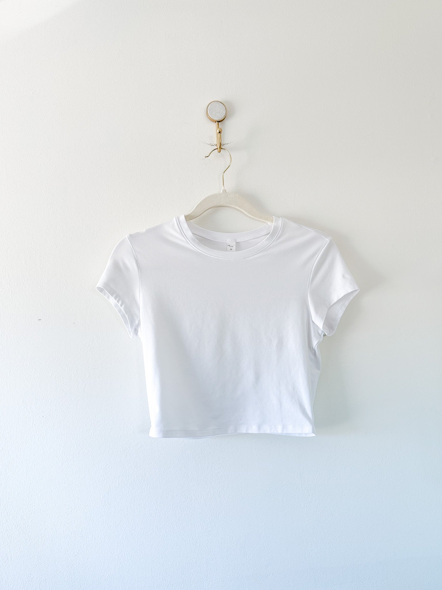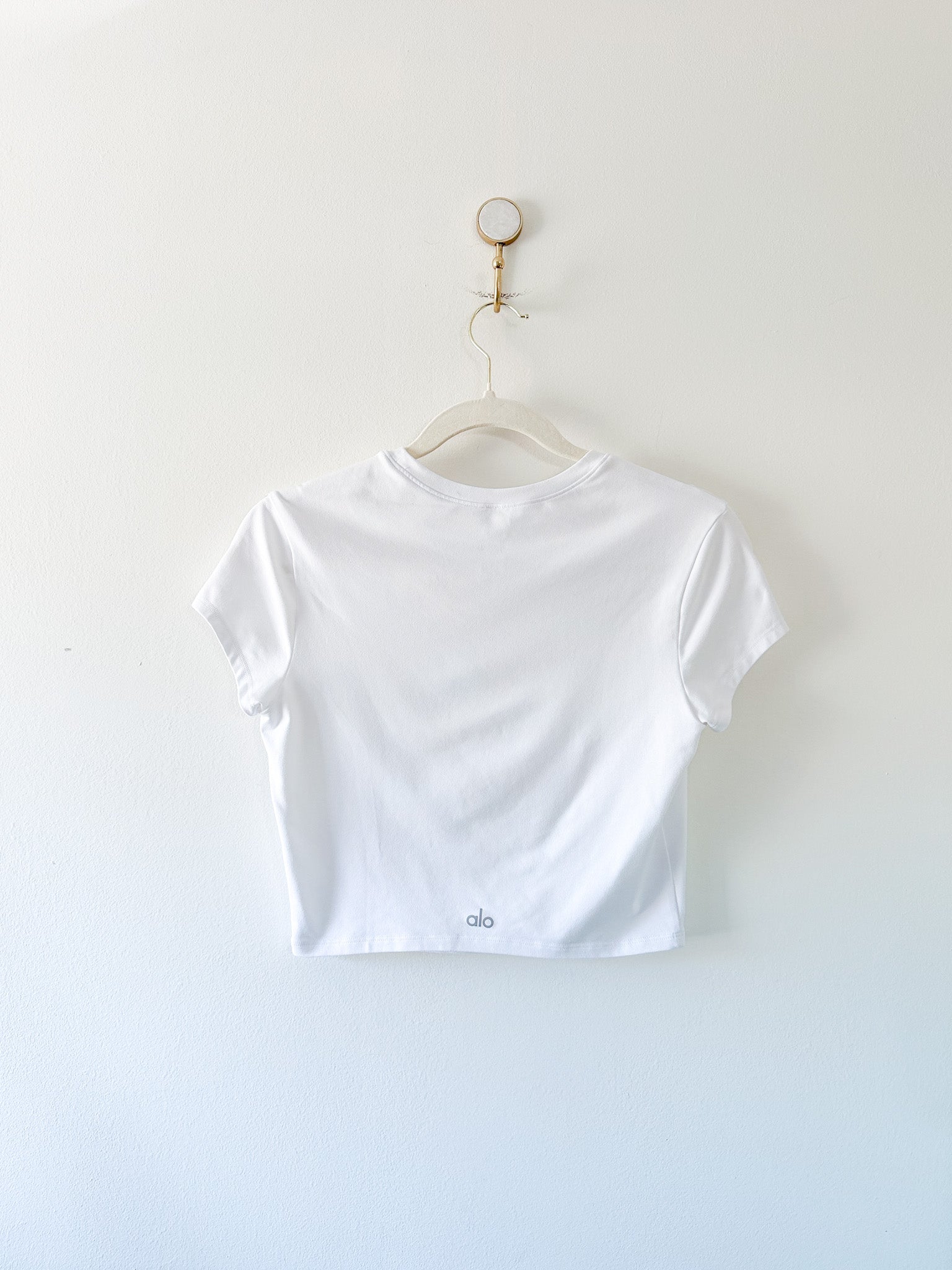 Meet your new go-to tee that transitions seamlessly from downward dog to coffee runs. This cropped short sleeve Finesse tee from Alo Yoga combines buttery-soft fabric with serious performance features, wrapped in a flattering baby tee cut that works as hard as you do. Whether you're flowing through class or living your best weekend life, it's the versatile piece every yogi needs in their rotation.