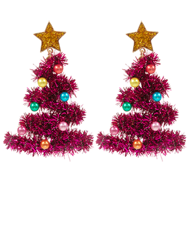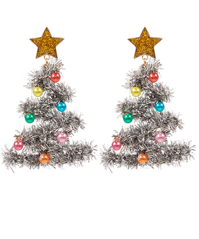 Get festive with these quirky Christmas Tree Tinsel Drop Earrings! The modern green tinsel design is complete with tiny ornaments and a gold star tree topper