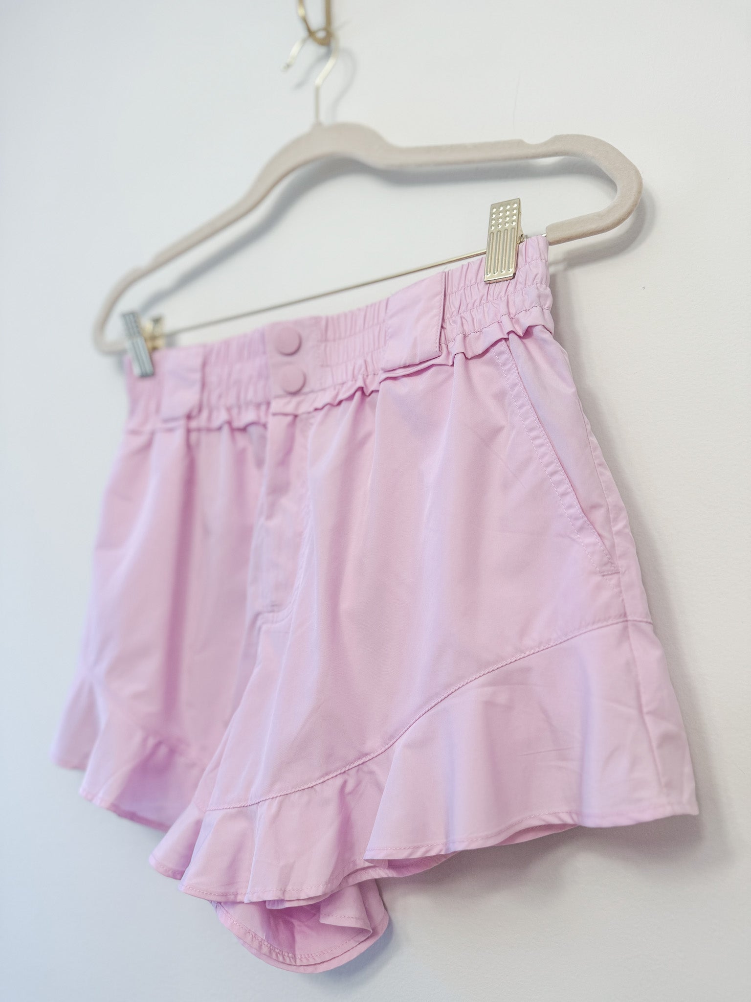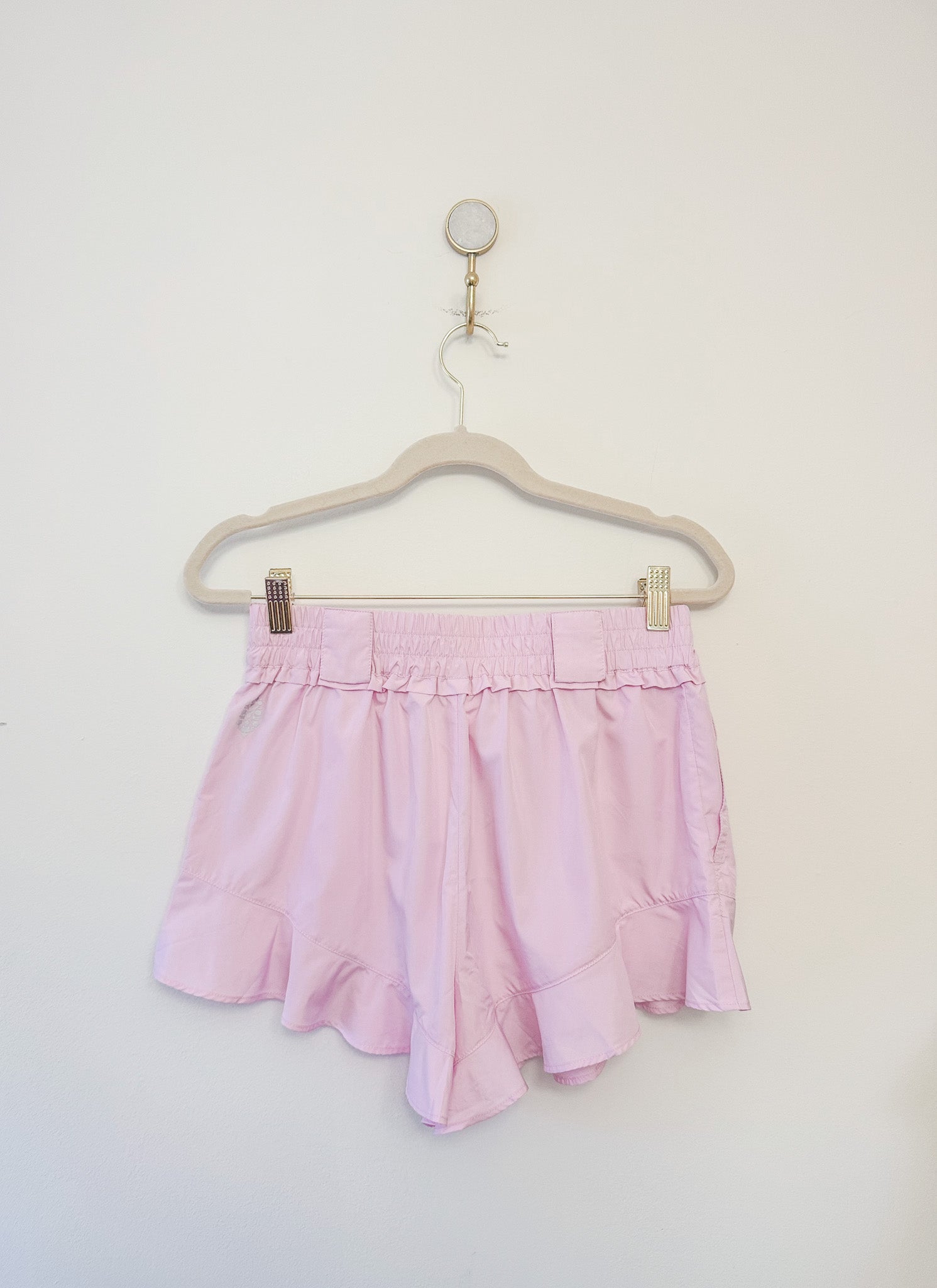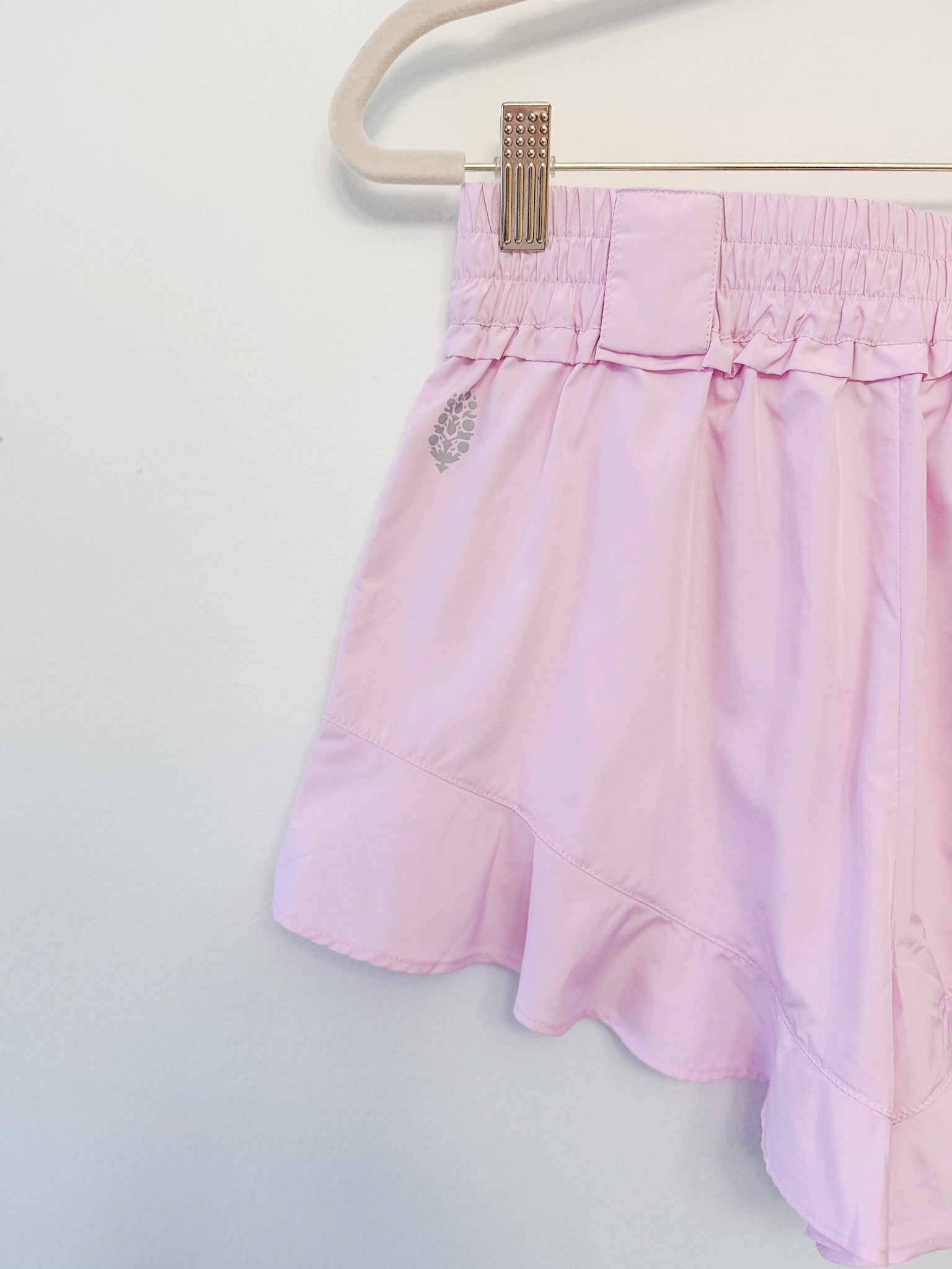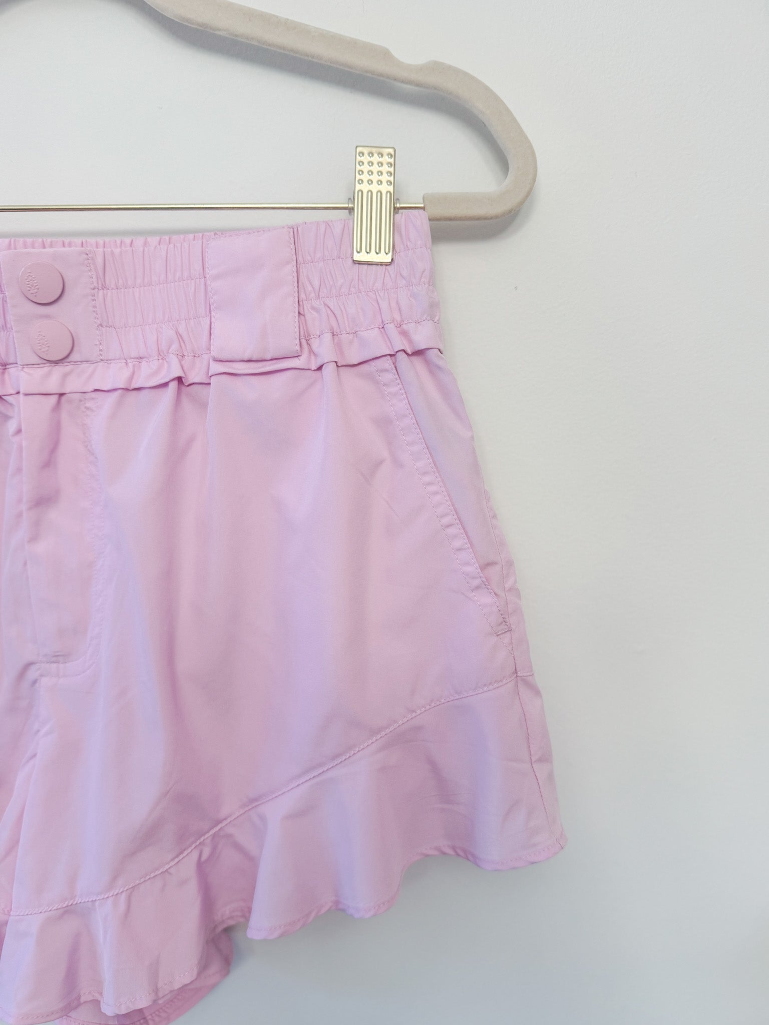 Elevate your activewear game with these charming FP Movement Wild Child shorts in powder pink, designed in a breezy, relaxed silhouette and finished with a cute ruffled hem for a playful flair.