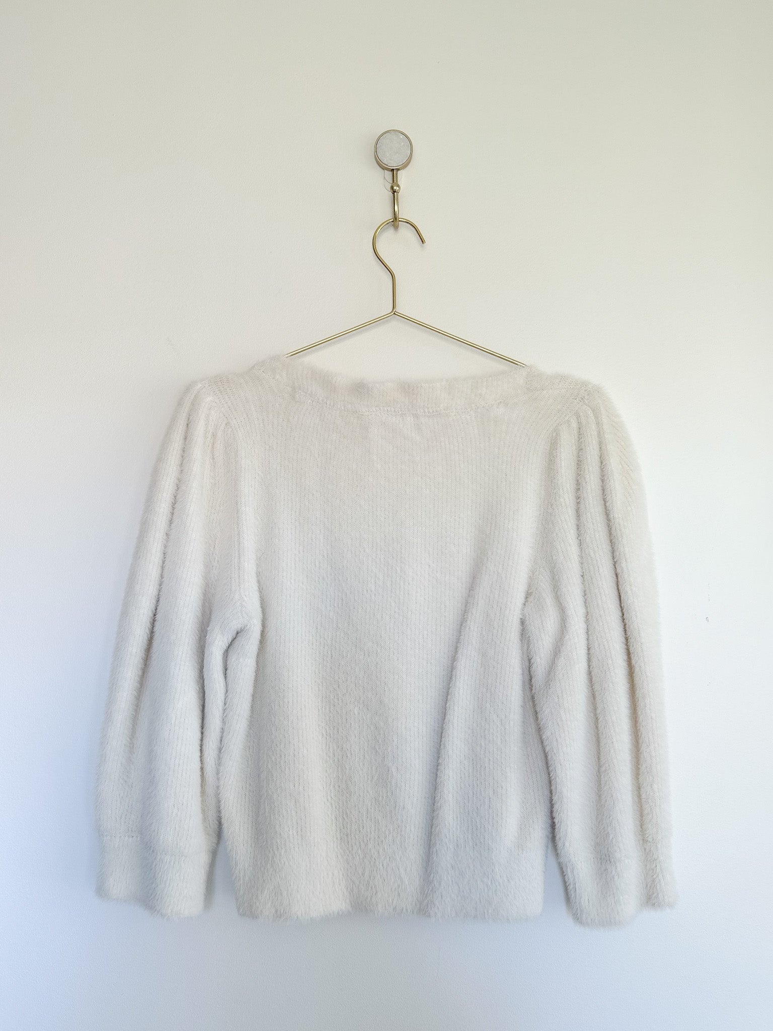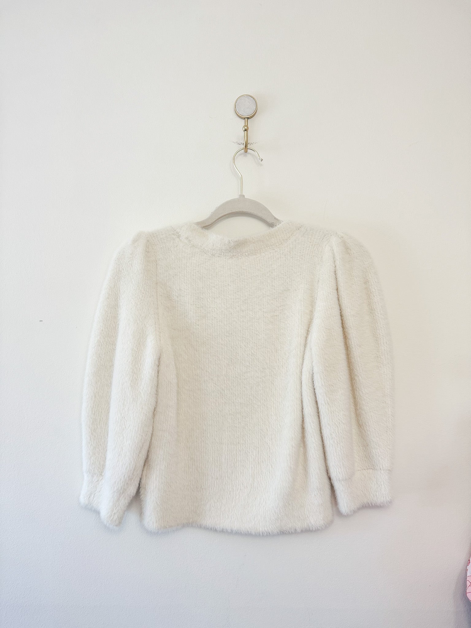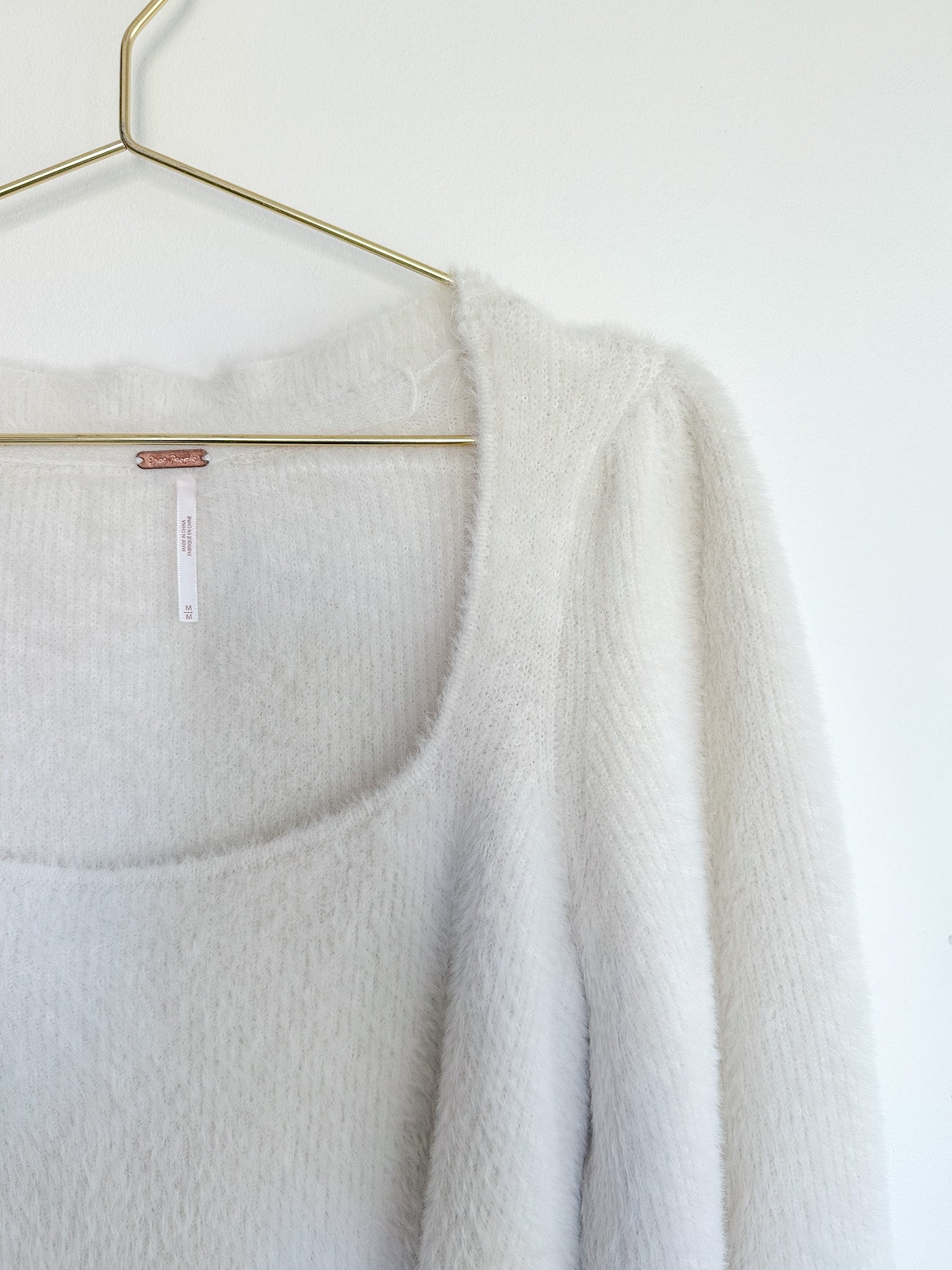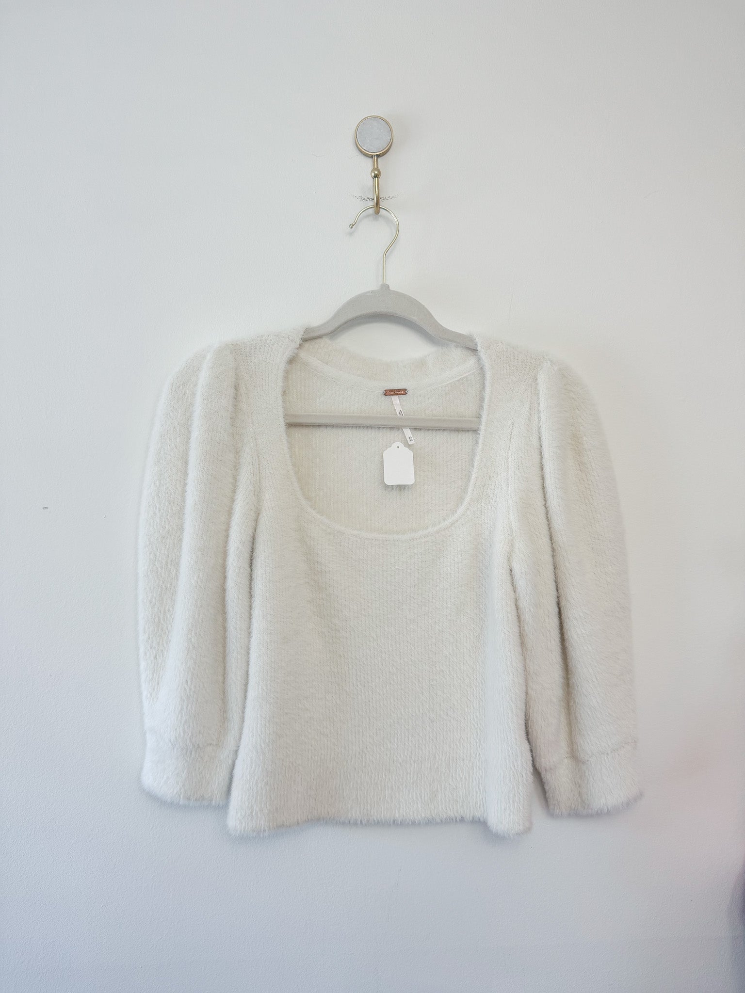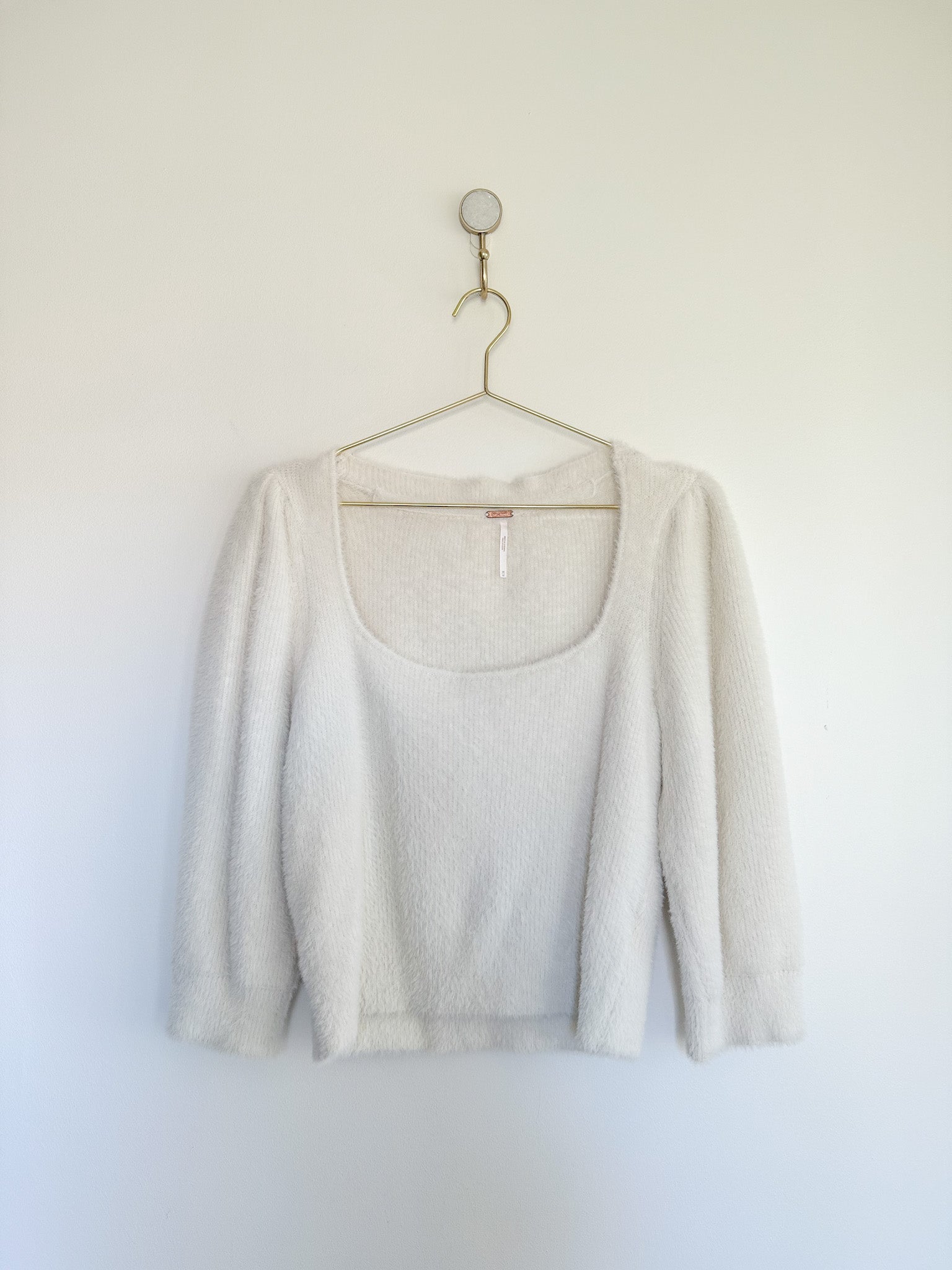 Your new go-to: the Free People Moonbeam cropped sweater in ivory. With a scooped neck, a three-quarter-length sleeve fit and fuzzy fabric with exaggerated puff sleeves, this sweater adds the perfect touch of texture to your look.