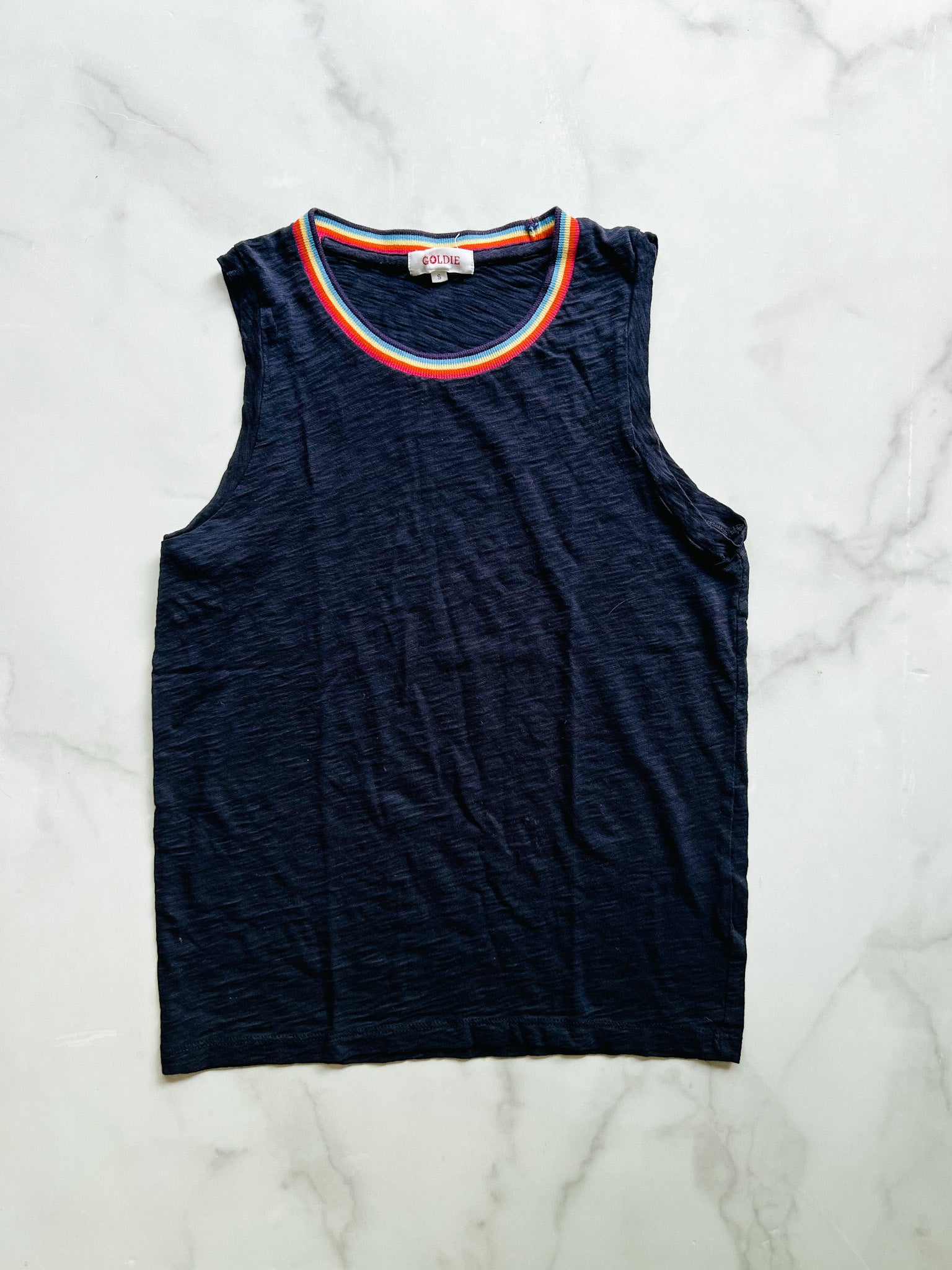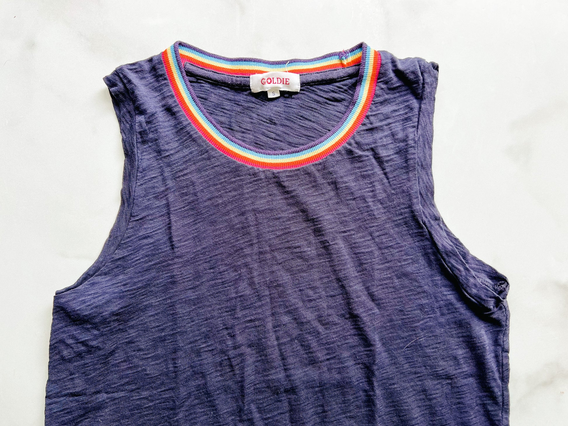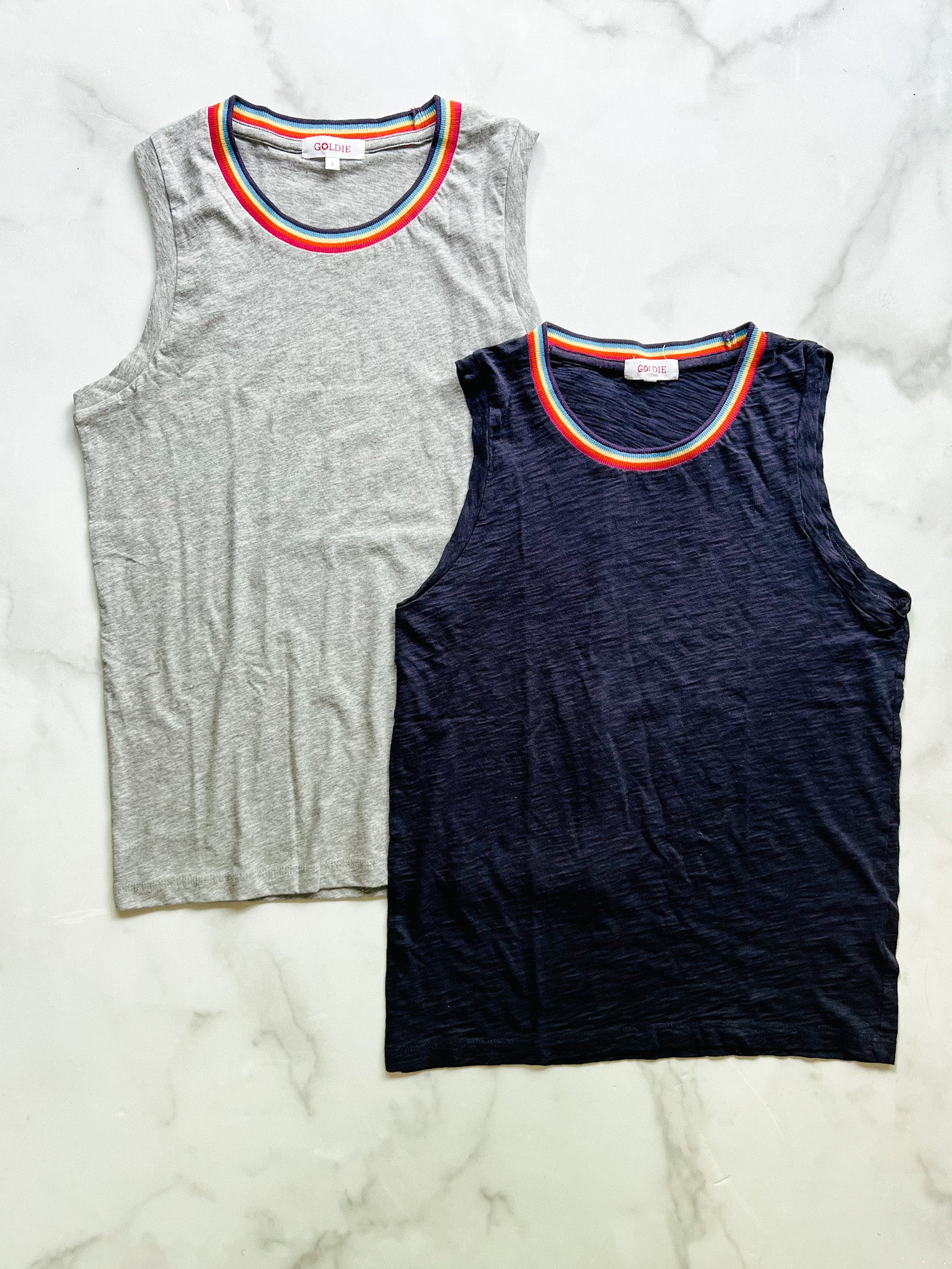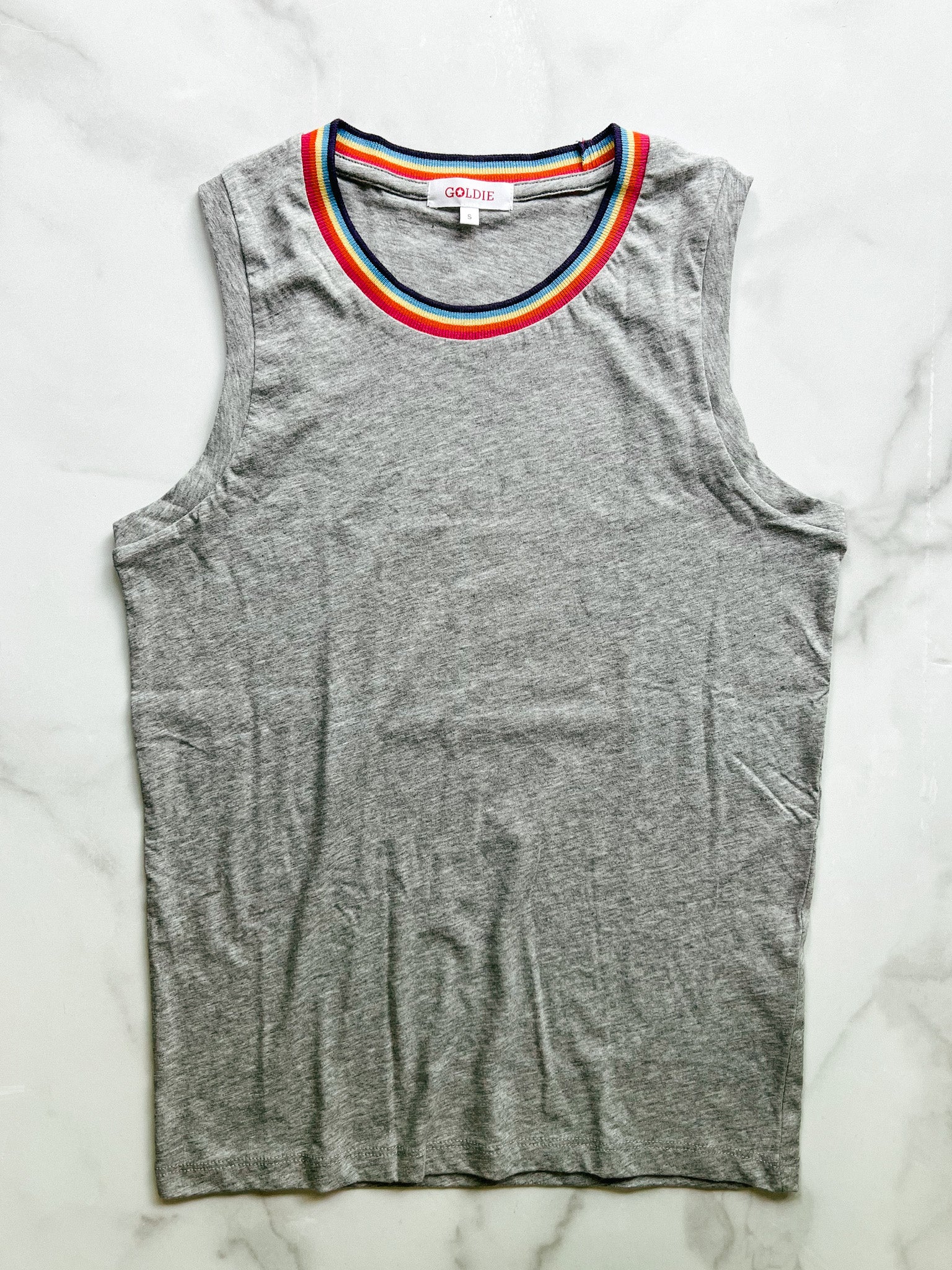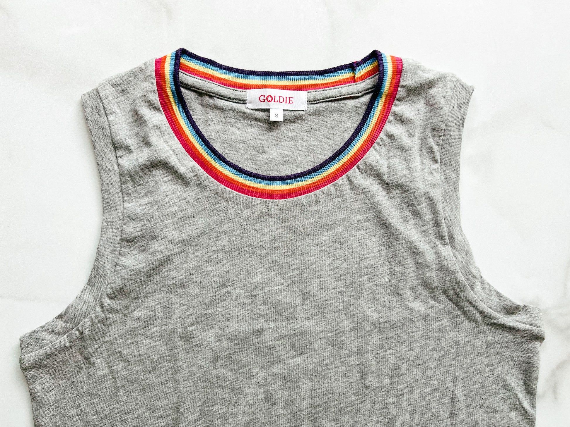 Adorable, versatile and the color pop your wardrobe needs - the Goldie Rainbow Tipped Crew Tank is a jersey knit comfy rainbow-collared tank, making you a vibrant presence everywhere you go.
