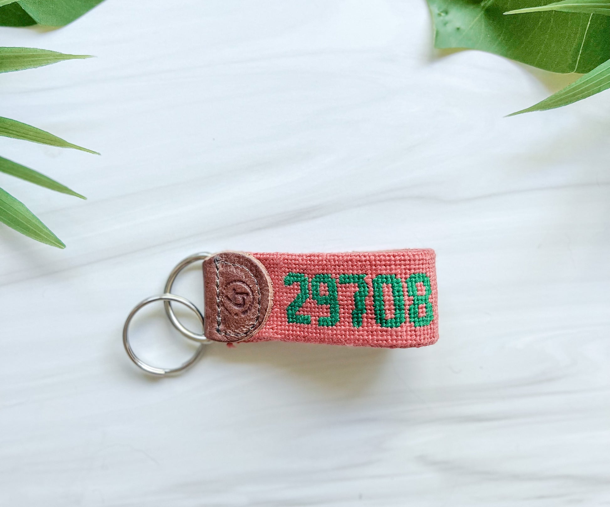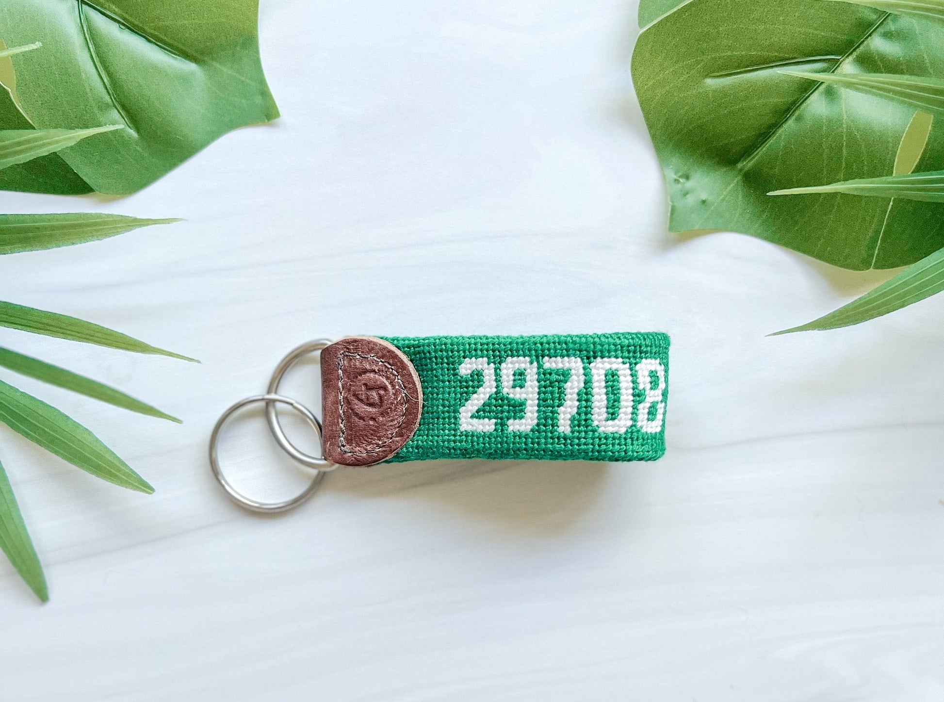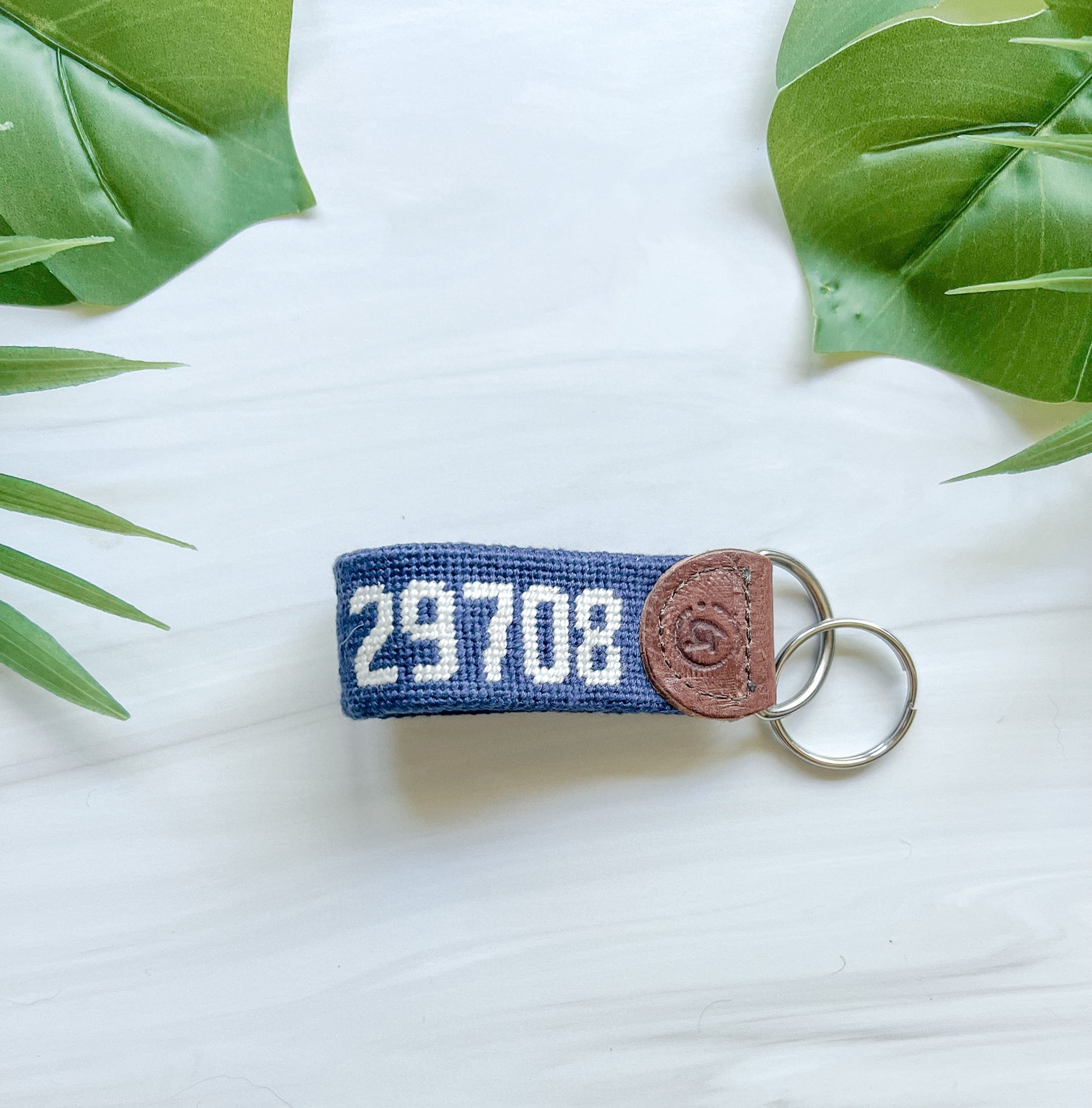 Handcrafted and customized, these needlepoint keychains from Good Threads come in a variety of colors and zip codes. Made with: pearl cotton thread, 18-count mono canvas, full-grain leather. In Fort Mill, South Carolina's zip code of 29708.