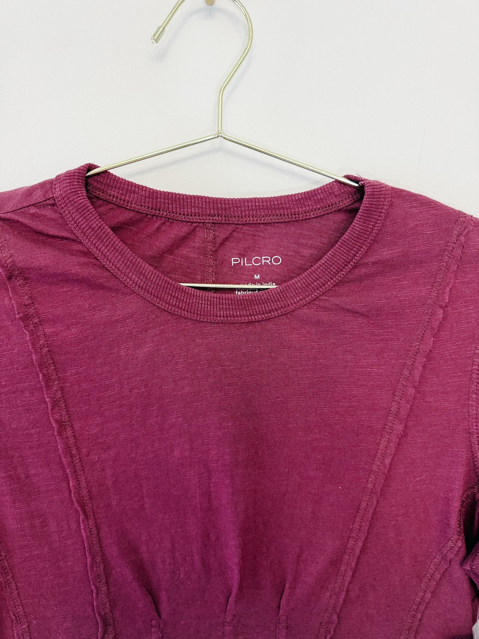 Elevate your basics with this gorgeous Pilcro by Anthropologie long-sleeved tee in a luxurious deep plum shade. Brand new with original tags, this piece brings unexpected sophistication to everyday wear. The thoughtfully placed seam detailing adds visual interest and dimension, transforming a simple tee into something special. Perfect for layering or wearing solo, this elevated staple is ready to become a wardrobe favorite that feels both polished and effortlessly cool.