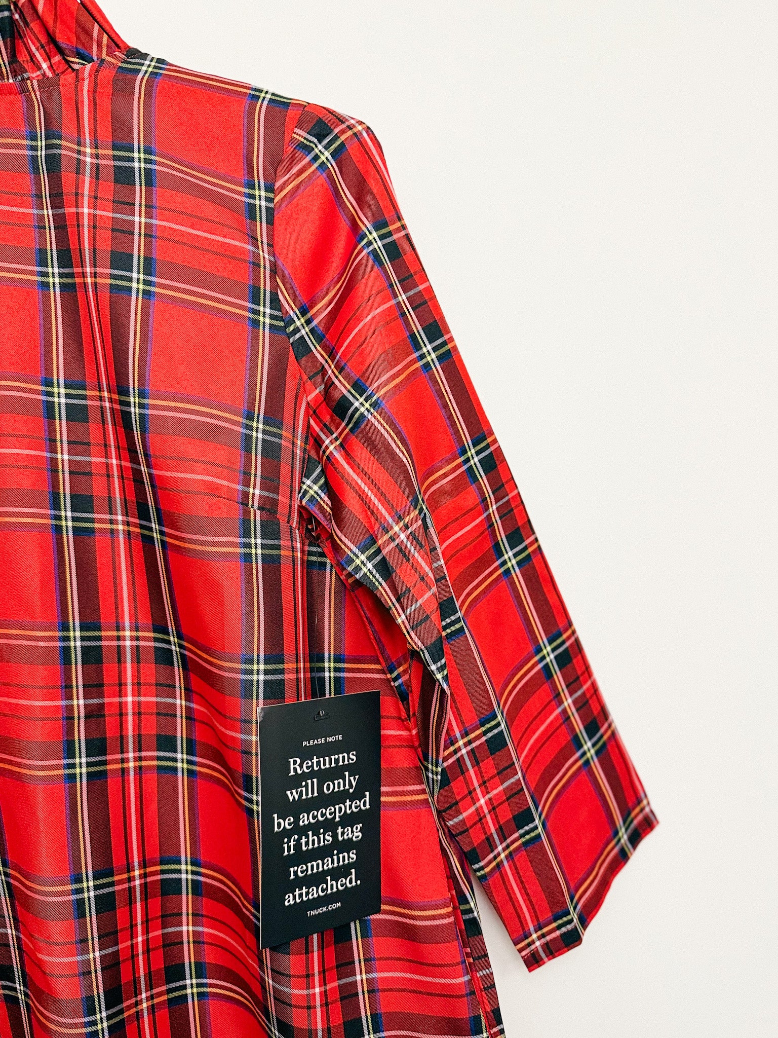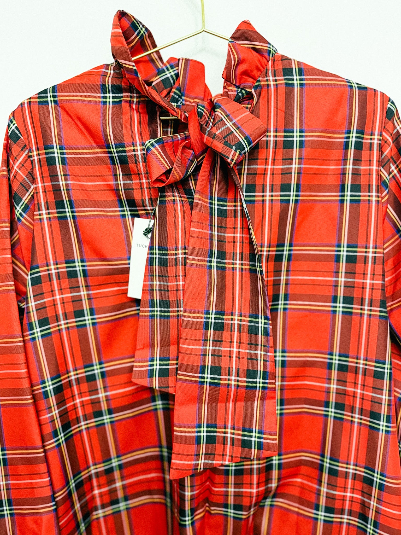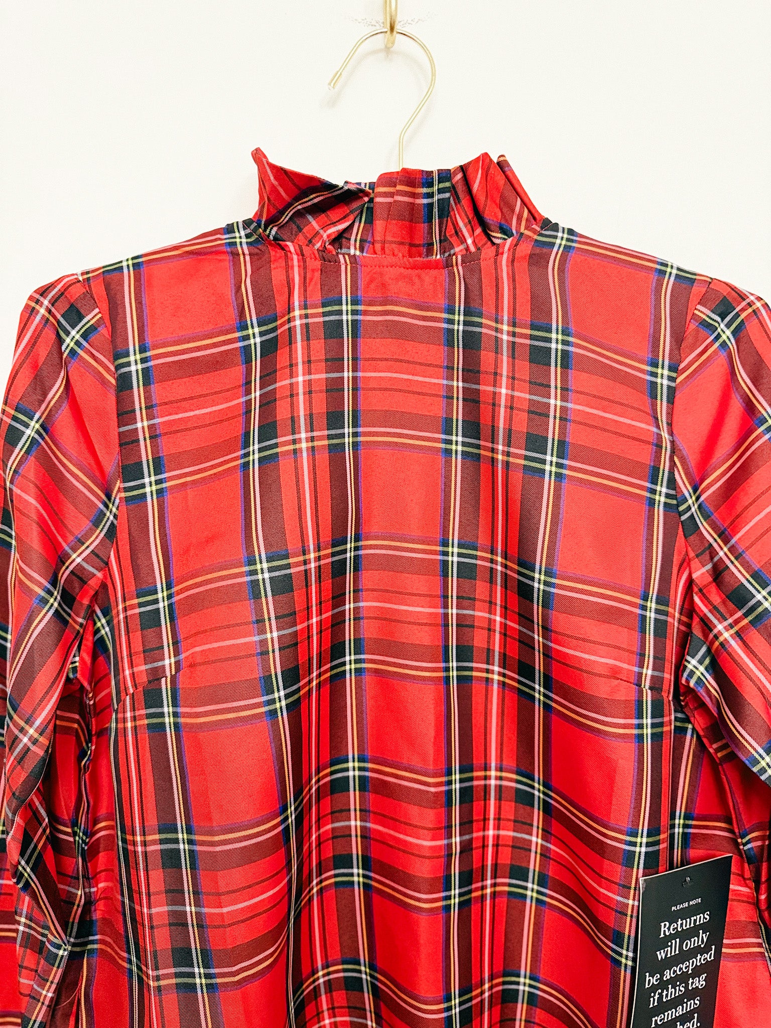 Brand new Tuckernuck Daphne mini dress in striking Royal Stewart tartan plaid. This statement piece showcases a high ruffled collar, three-quarter sleeves, and a flattering shift silhouette enhanced by a decorative tie-sash bow at the neckline.