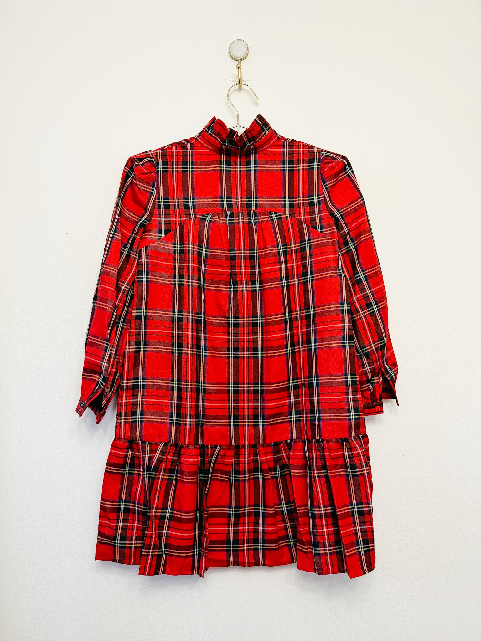 This striking Tuckernuck Palmerston Dress showcases the timeless Royal Stewart Tartan in a design that balances elegance with playful energy. The structured ruffled collar and extended sleeves deliver refined sophistication, while the abbreviated hemline and voluminous skirt create movement and visual interest.