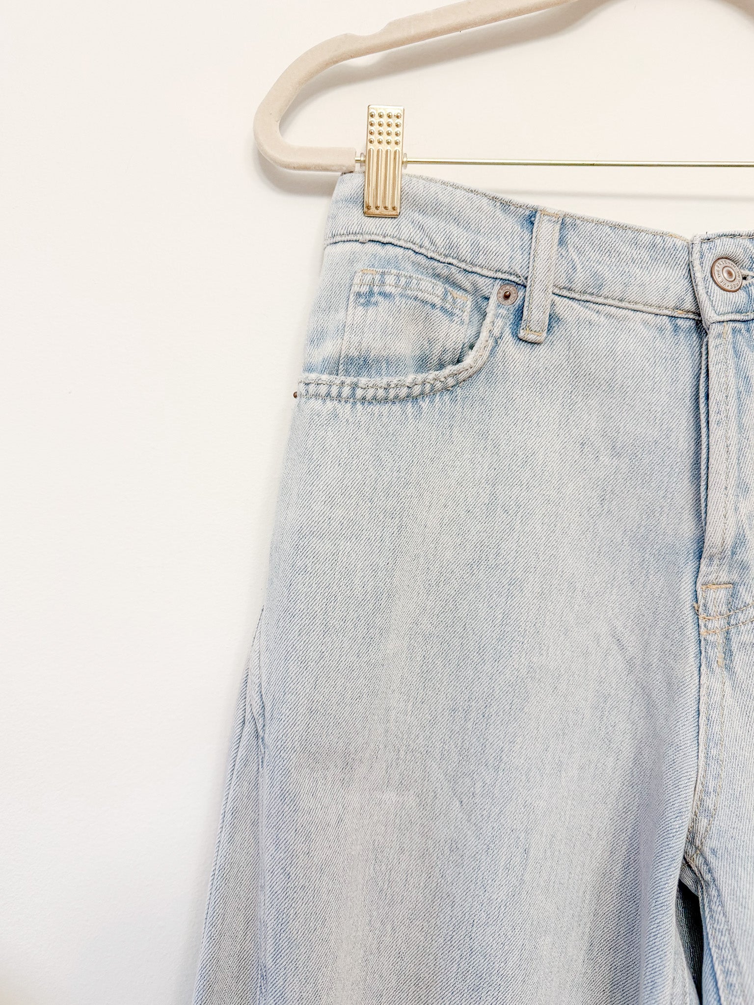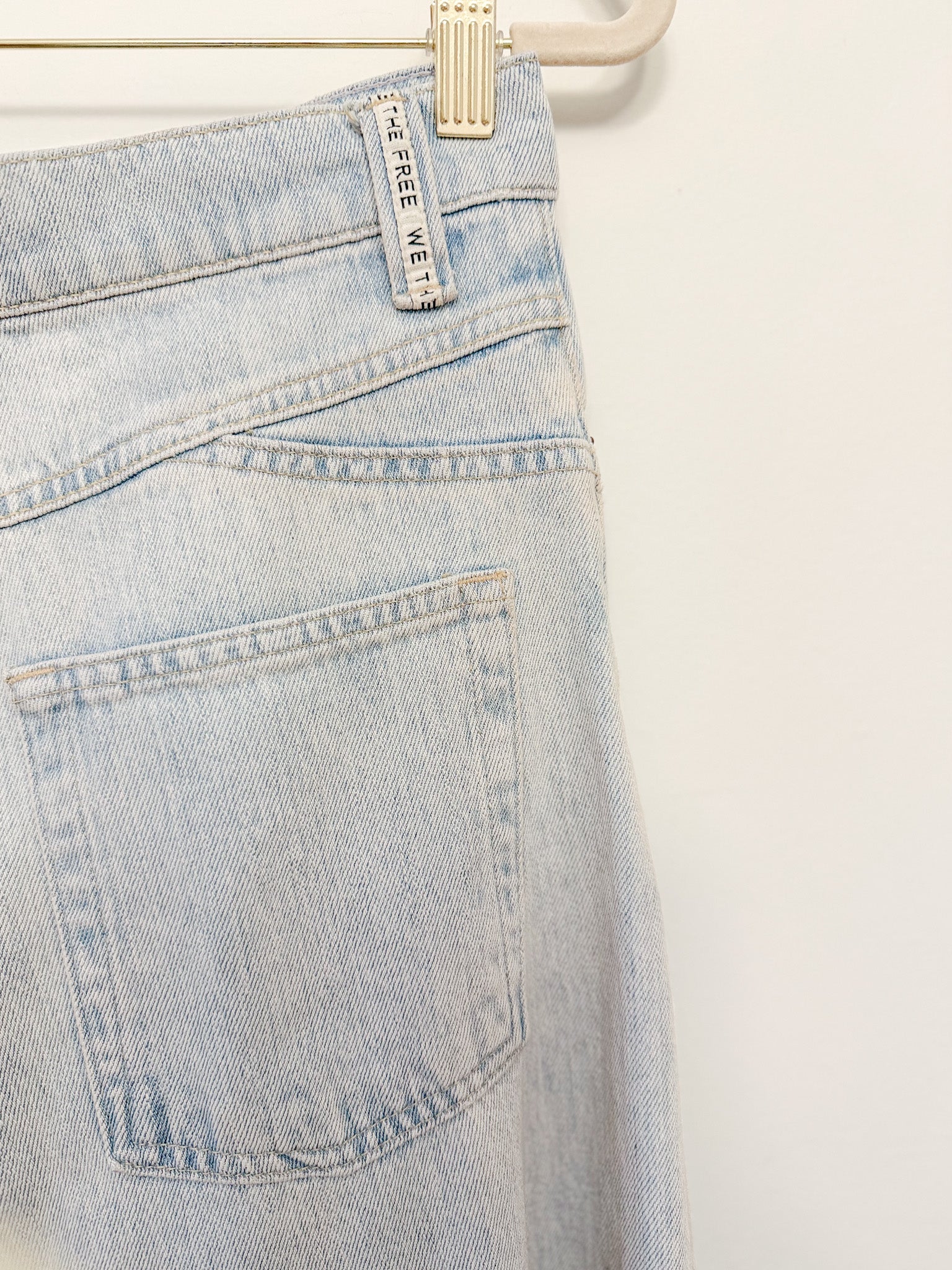Structured barrel legs lend shape to these We The Free Westward Demi jeans, size 24 - nonstretch jeans accented with slash-like darting and allover sanding for a vintage look.